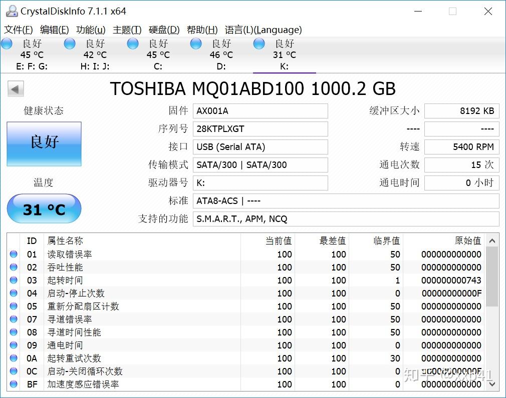 接入电脑,显示格式为exFAT格式,可用容量为931GB,不要更改硬盘的格式,不然其他格式手机是无法读取的,所以要注意。CrystalDisklnfo检测爱国者 HD800 移动硬盘使用的是东芝5400转的硬盘,下面检测一下它的读写能力。