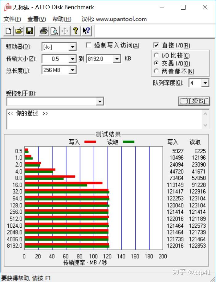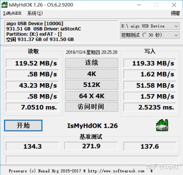 ATTO 2.47跑分成绩: 跑分看来在32KB文件开始,读取速度到了约122MB/s,写入速度达到了约121MB/s,在测试数据包到达32KB之后的数据包容量读写速度测试都保持在了这个读写速度。使用IsMyHdOK 1.26跑分读写成绩也跟ATTO 2.47比较接近,所以这块移动硬盘还算可以,测试是基于PC端,手机读写的话肯定会慢过PC端。