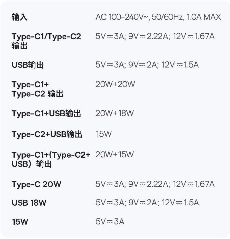 4. Type-C1+Type-C2+USB同时输出的话,c1口输出20w;c2口+usb口共15w。