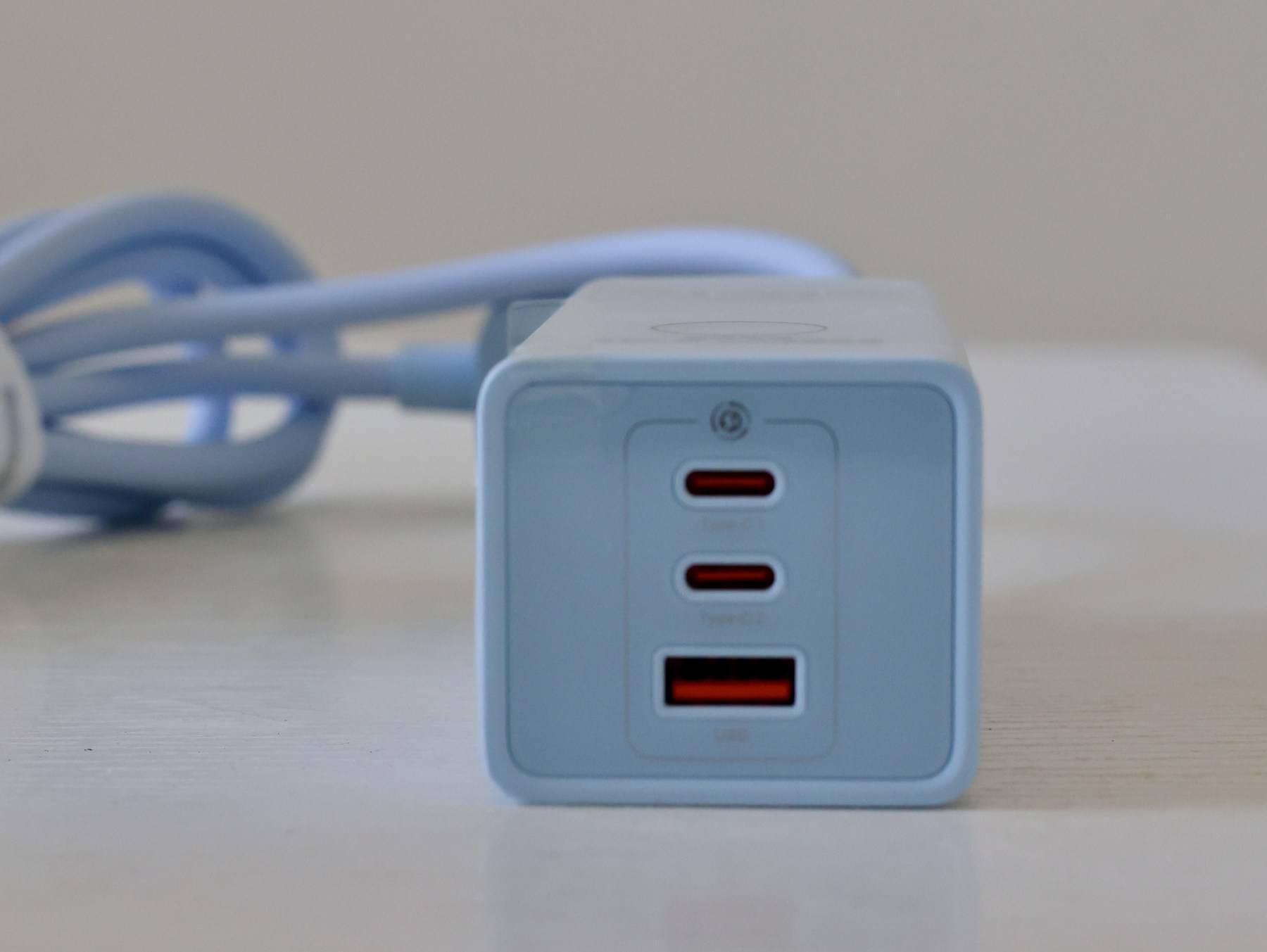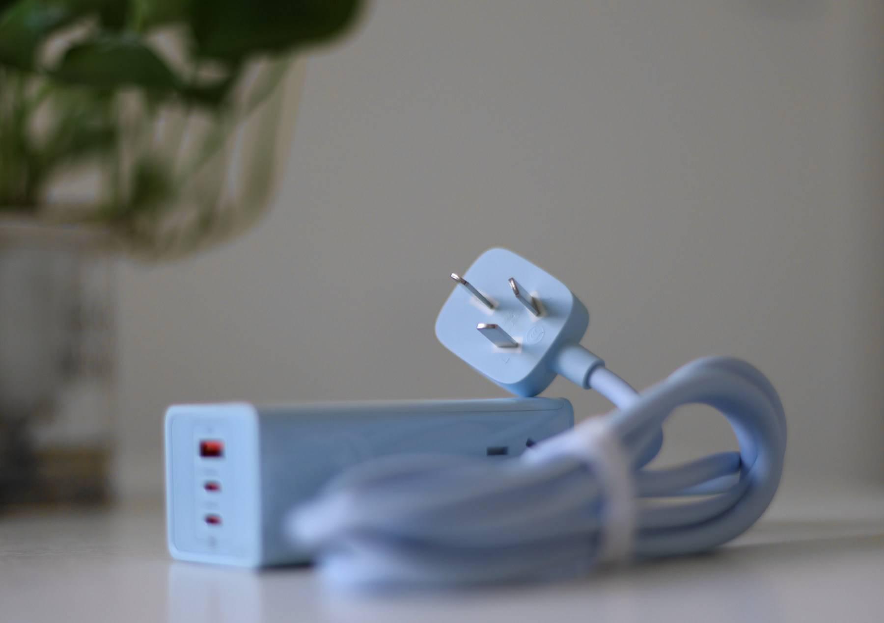 打开抽屉式的包装,淡蓝色的充电器本体映入眼帘,第一反应就是不错,颜值在线,是我的菜。
