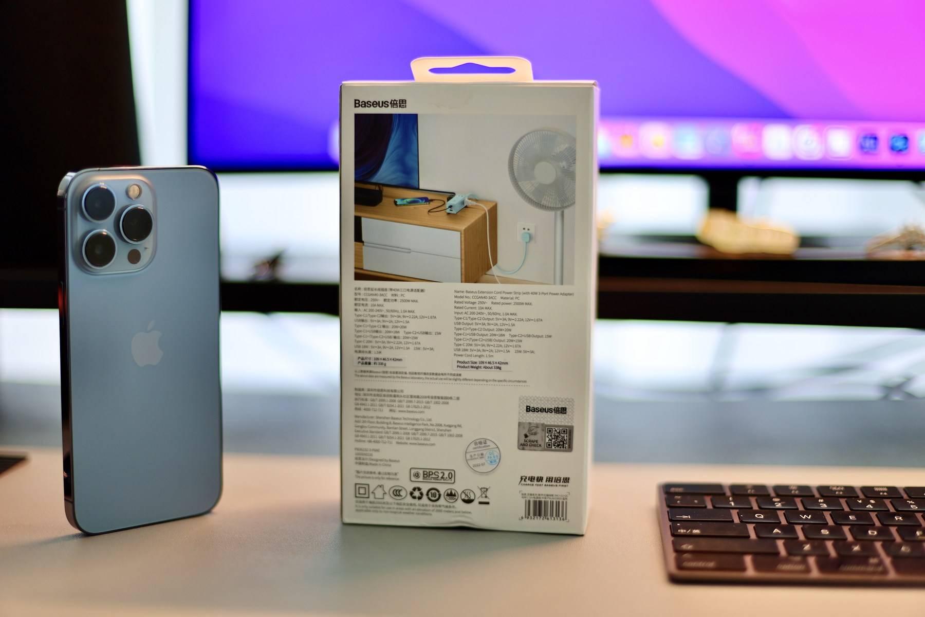 倍思·灵傲系列数字式插线板三围尺寸为109mm✖️46.5mm✖️42mm,类似于小充电宝尺寸;重量约338g,约等于两个iphone 13的重量;电源线1.5米,保证了足够距离的插头覆盖。